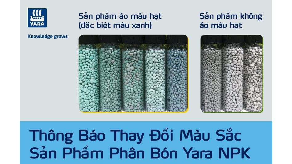 Trước những biến động của nguồn cung nguyên vật liệu trên thị trường thế giới do ảnh hưởng của xung đột Nga-Ukraine, Yara đang tích cực tìm kiếm và chuyển đổi nguồn cung nguyên vật liệu nhằm đảm bảo không đứt gãy chuỗi cung ứng sản phẩm. Do đó, màu sắc của nguyên liệu sẽ có một ít khác biệt so với hiện tại. Đặc biệt, màu sắc các sản phẩm NPK của Yara sẽ có sự thay đổi so với trước.