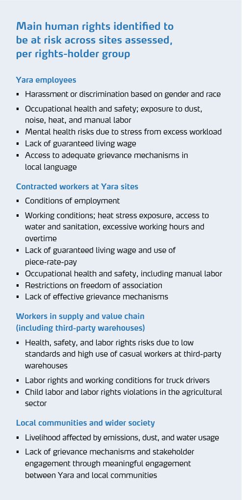 In addition, HRIA findings have improved our understanding of the main human rights at risk of adverse impact in Yara’s value chain. These are presented in our Code of Conduct and in the section below outlining identified impacts. We recognize that this landscape may change, and that we need to continuously monitor the potential impacts from our operations and value.